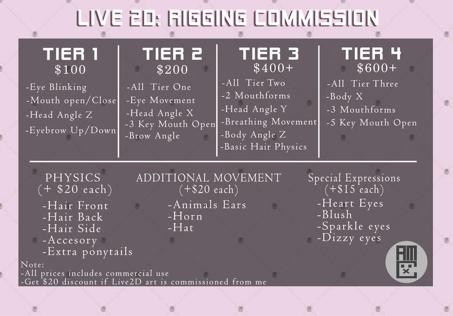 Notes:-Discount if you commission me for the art as well-Live2d Avatars for Facerig prices includes commercial use for streaming,videos,etc-You must have correct Layered Art File ready for rigging-Artwork must be your own, or commissioned from another with permission to use for live2D, credit will be given to the original artist-I'm allowed to post a watermarked (gif loop version) and will link to any socials you want to promote for you (twitch, youtube etc)